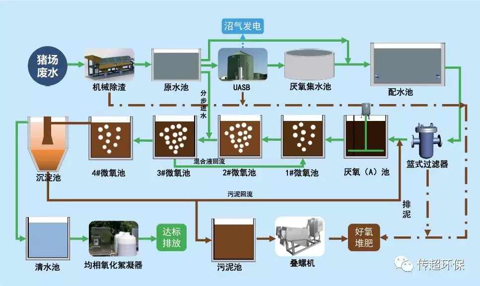 針對畜禽養殖廢水厭氧沼液可生化性較差(B/C <0.3)、碳氮比較低(C/N<5)、總氮削減難度大等共性問題,傳超環??萍悸摵险憬髮W環防所以短程硝化反硝化(PND)和同步硝化反硝化(SND)原理為基礎,通過優化集成養殖廢水預處理、SFAO4微氧曝氣生物處理、自養脫氮耦合反硝化除磷、均相氧化絮凝處理等關鍵技術,創建了新型畜禽養殖廢水高效低耗脫氮除磷成套化技術模式,并在萬頭以上規模豬場建立工程示范。