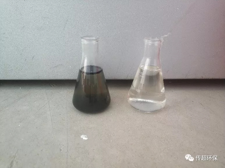 進出水水樣對比(左:原水;右:出水)